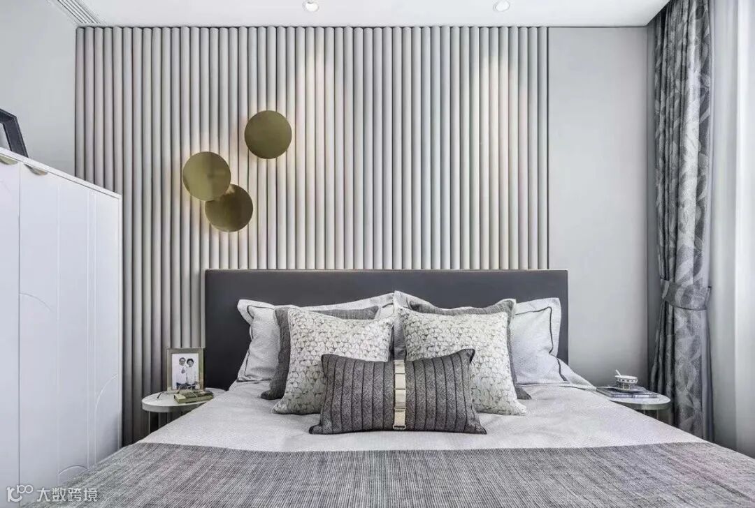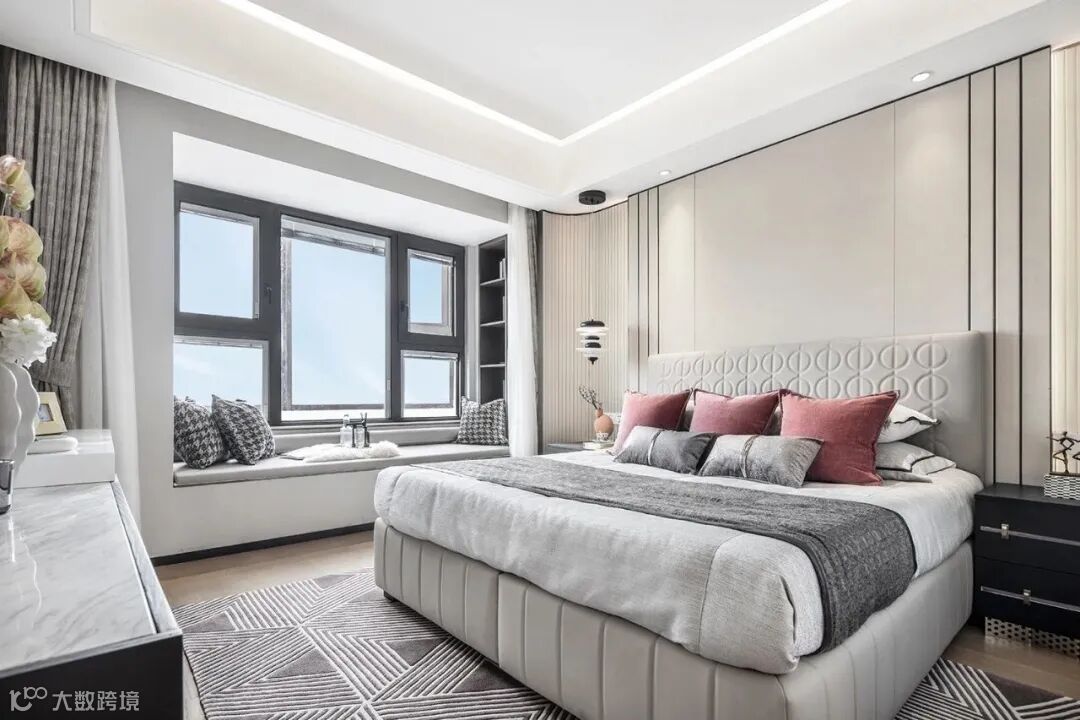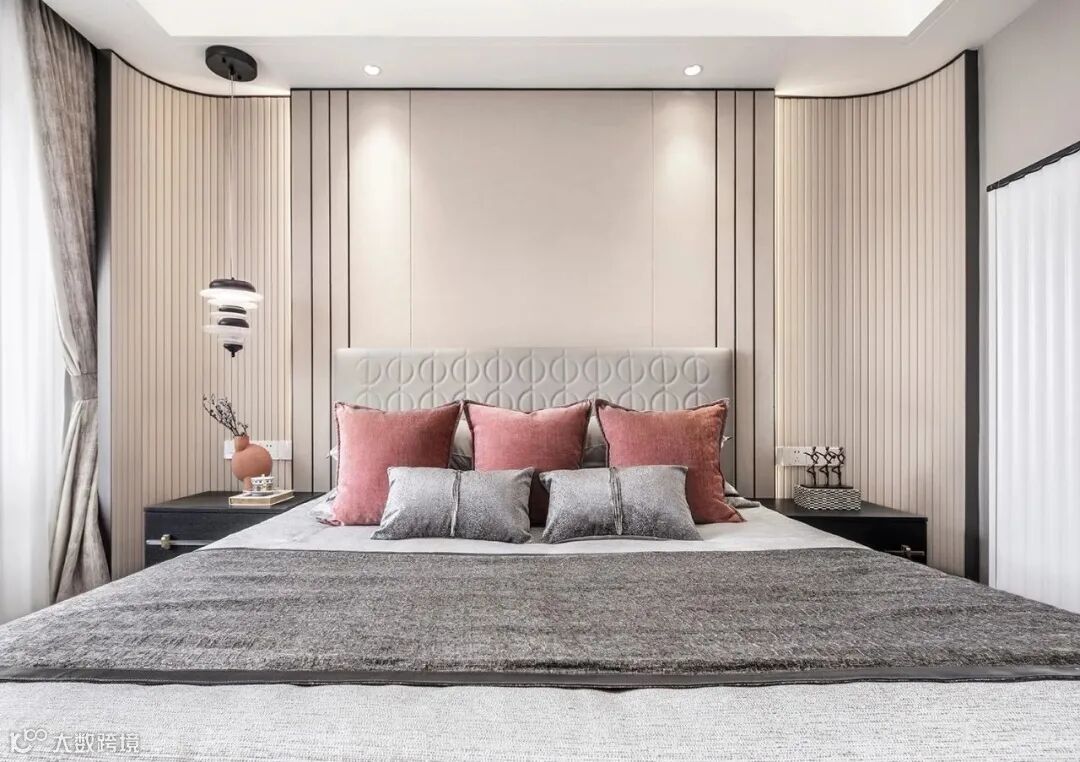 卧室空间整体配色与客厅空间相呼应,低饱和度的灰阶中加入了珊瑚色系的单品,并搭配创意软装点缀,打造出时尚艺术、富有格调的生活空间。