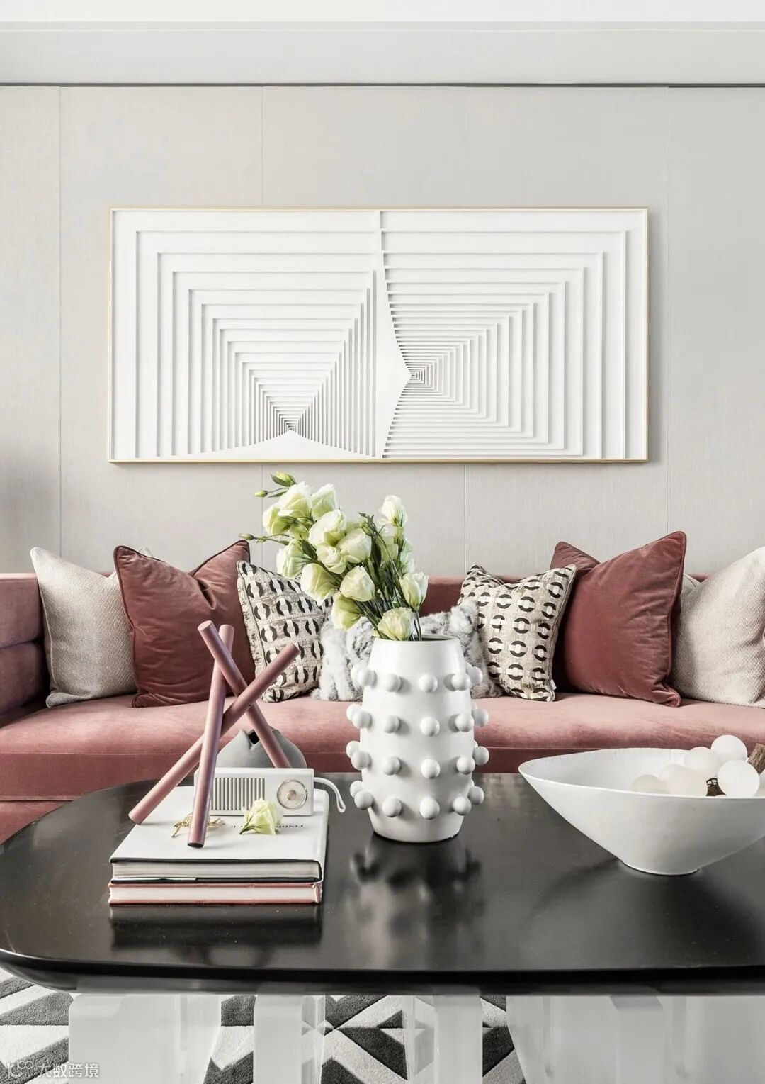 绒面材质优雅柔和,色彩本身的情绪与空间角色通过质感的表现得到了完美的加持;抱枕将空间的色彩及元素通过面料和肌理演绎得十分吸睛;茶几则把不同材质和色彩间的对比融于一体,不过分跳脱而又个性十足。