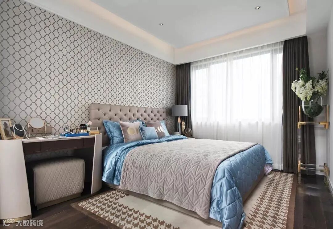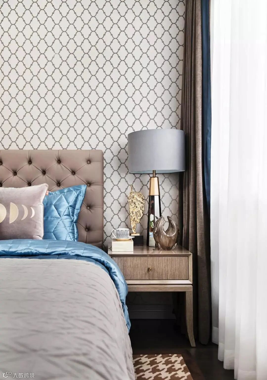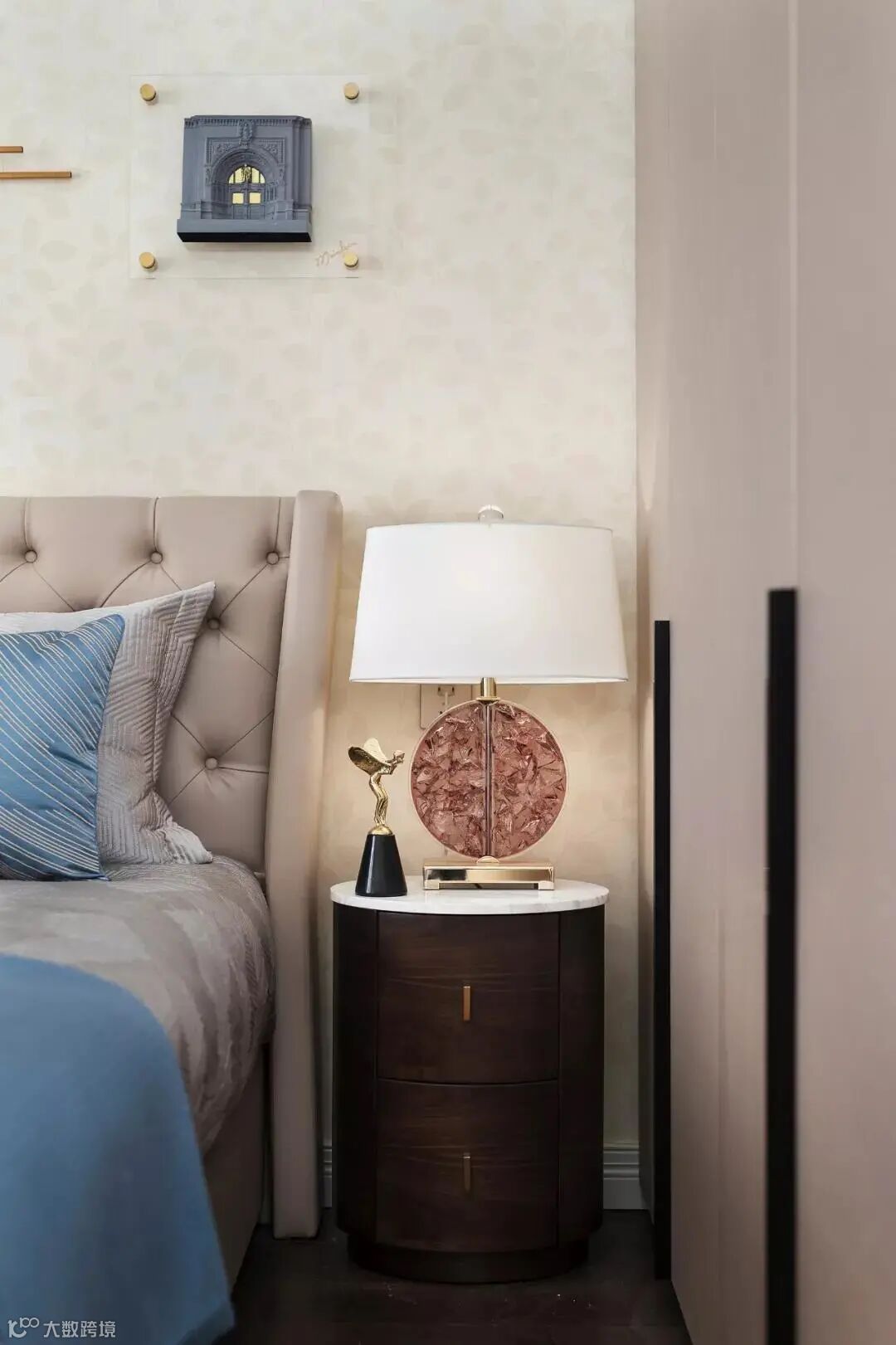 次卧柔和的暖色背景墙,让人心情平和,营造了一种温馨舒适的感觉。金色的摆饰和挂饰作为点缀,既增添了几分活泼,又将含蓄的高端展现了出来。