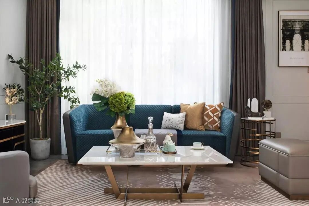 客厅方正采光好,家居布局落落大方。素雅的白色是主基调,而蓝色的布艺沙发搭配对比色的抱枕,则让整体造型更有层次感;金色的器皿、新鲜的绿植,奇妙的碰撞让整个空间富有活力。