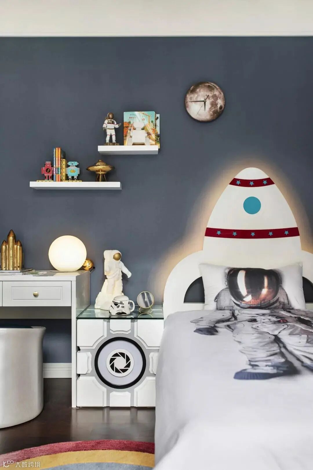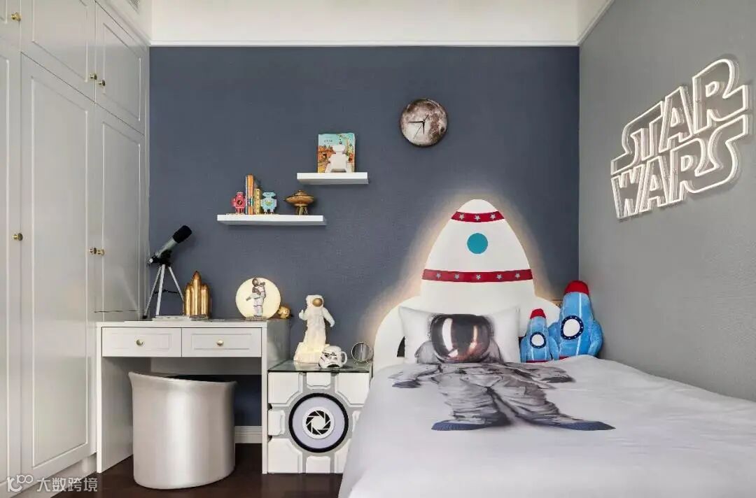 儿童房的设计风格别树一帜,宇航员模样的被子、酷似火箭的床头垫、STAR WARS的挂饰、深色的背景墙......太空元素随处可见,满足了儿童的好奇,天真浪漫。
