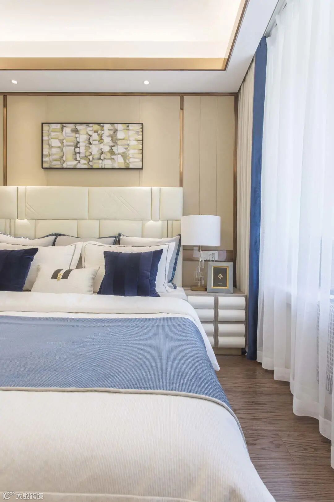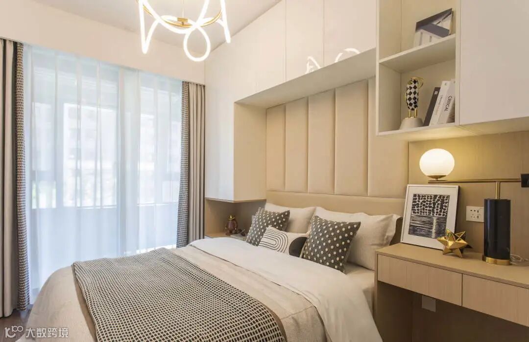 进入主卧,设计师将优雅格调以温润素色诉诸于人的知觉,运用柔和温情的色彩来渲染空间主人的休憩空间,协调统一的色调使整个主卧空间透露出温柔的气息,大气又奢华。