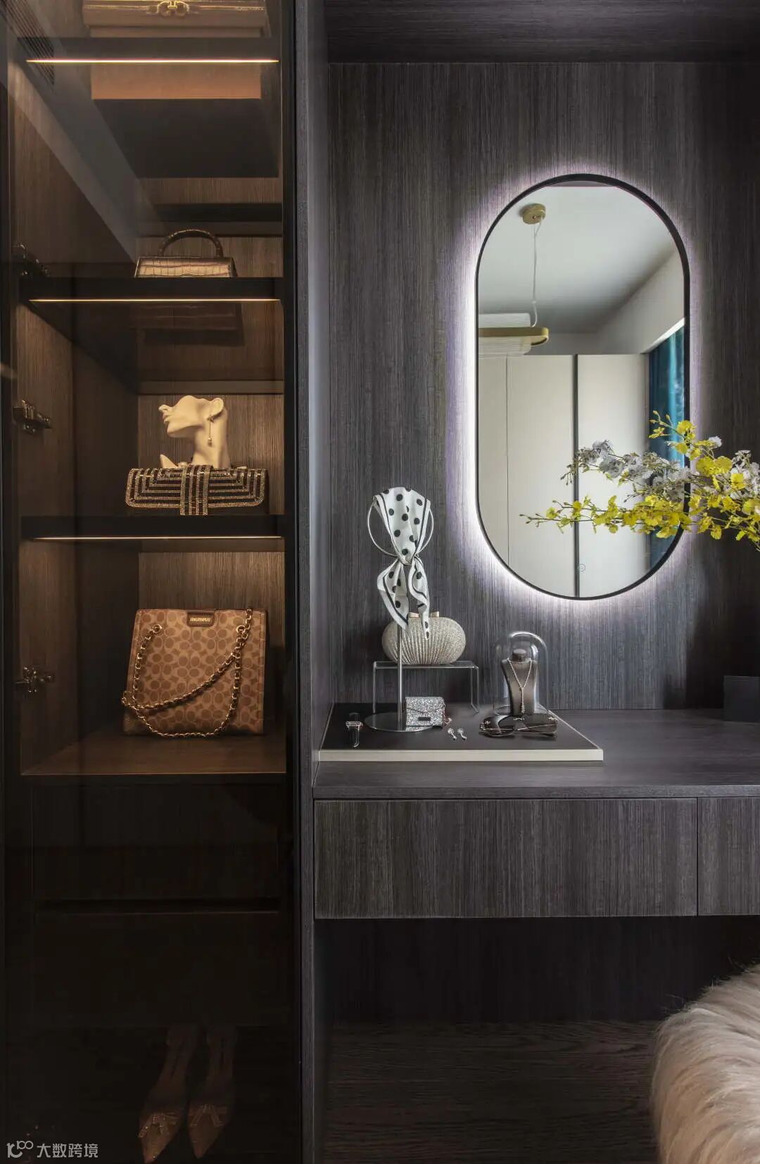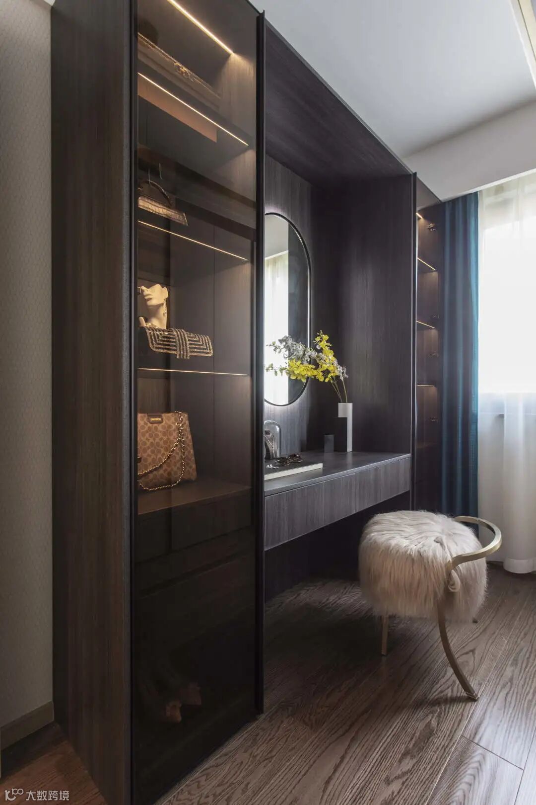 衣帽间是居者生活仪式感的重要一环,设计上突出时尚、大方的气质氛围,建立为居者量身定制的美学秩序,艺术化的生活也因此成为一种范式的尺度而充满乐趣。