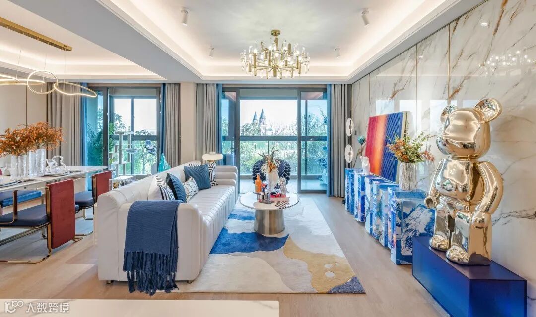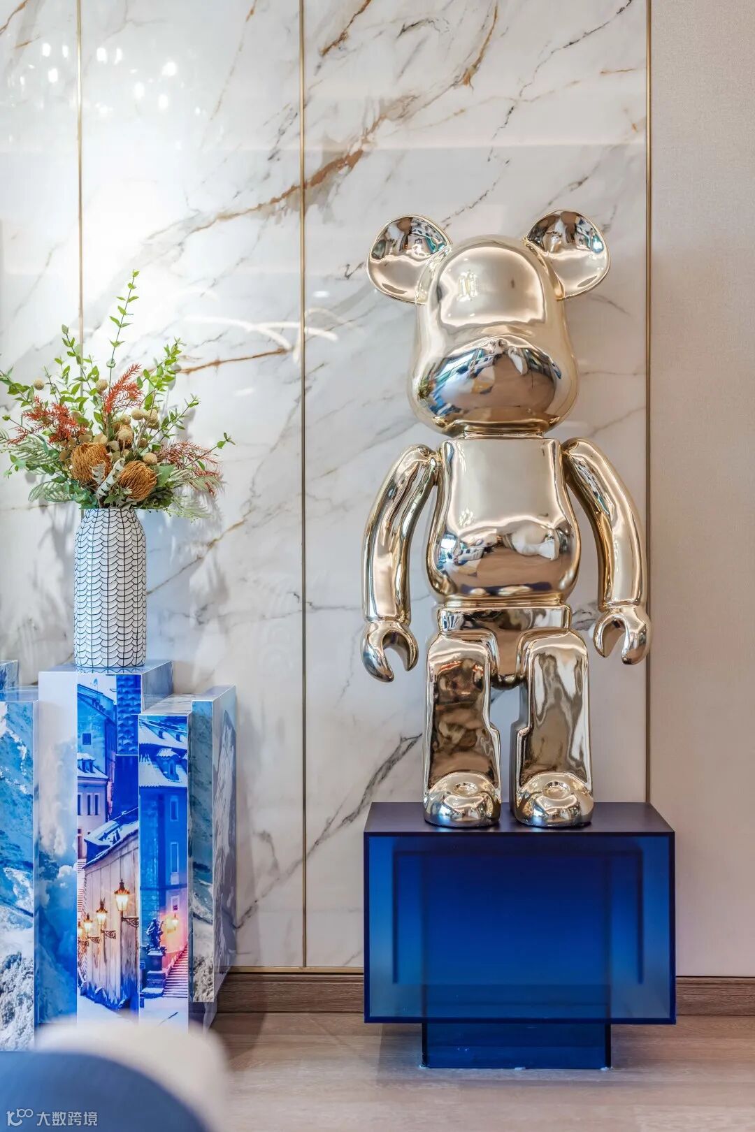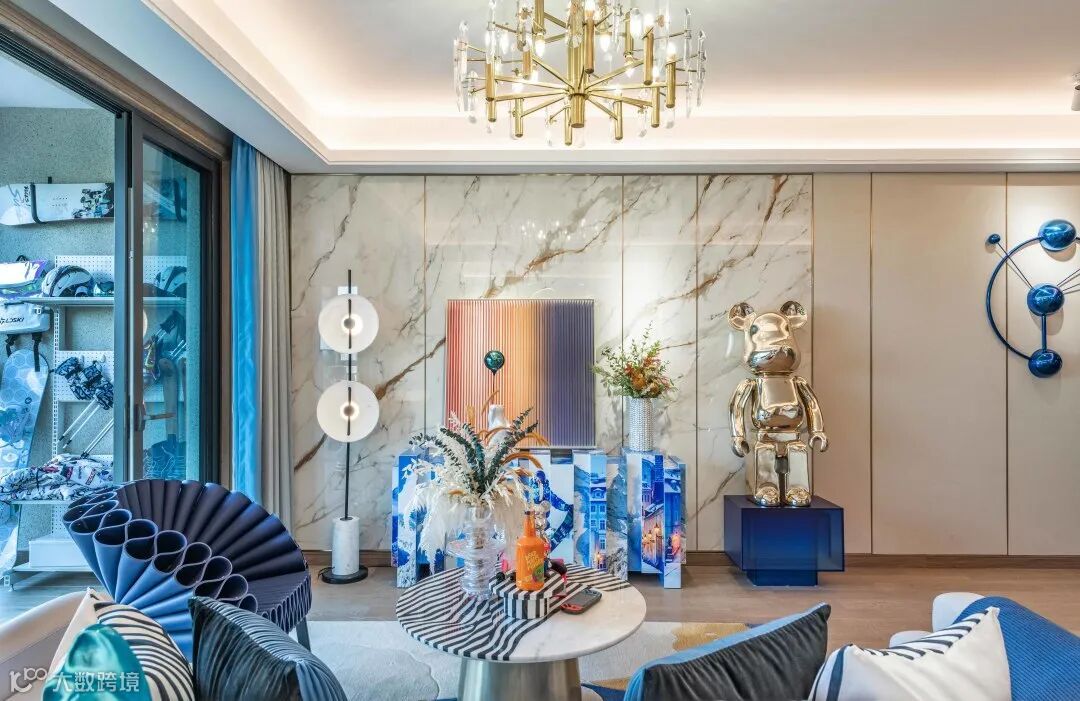 客厅将潮玩与空间相结合,Bearbrick形象为空间注入潮玩艺术性。色彩搭配是客厅的一大亮点,个性的蓝把客厅、餐厅一体贯通,空间瞬间流动起来。活力橙与经典蓝的品位之交,遥相辉映,各生欢喜。