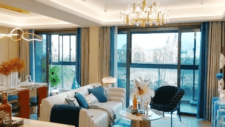 宽敞的双落地窗能最大限度把阳光引入室内,强化空间的通透感,客厅和阳台形成环绕型动线,整个空间一气呵成,尽享自由。