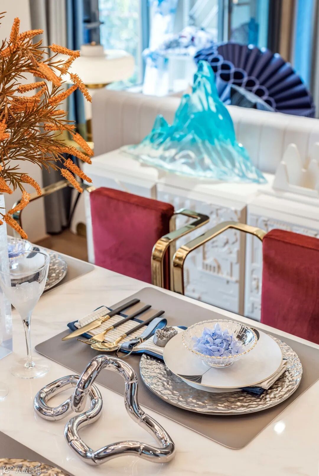 这里,极限运动的“雪花”从客厅吊灯散发出力量的光芒,照映在“节节高升”的沙发上,寓意着一种更高、更快、更强、对追求极限永不满足的奋斗精神。雪山的美景与家具的造型被设计师完美的通过设计无缝的融合起来,把一生中的美好永远的留在了客厅。