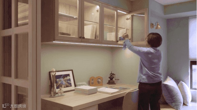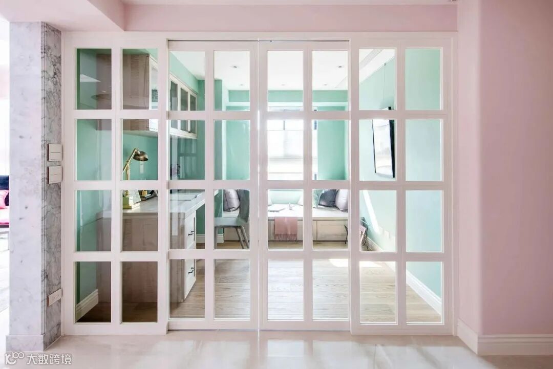 书房空间用绿色做设计,虽然绿色和粉色是对比色,但中间有一道白色格子拉门,可以模糊界线,让2个颜色可以很自然地融合,不会在整体的开放空间中显得突兀。
