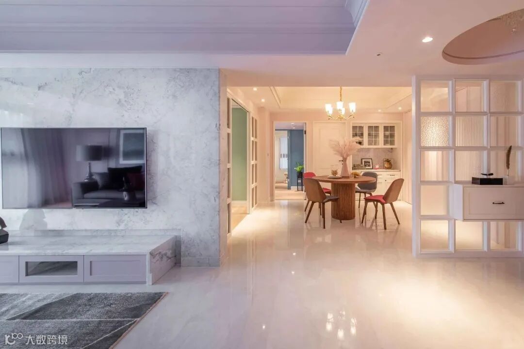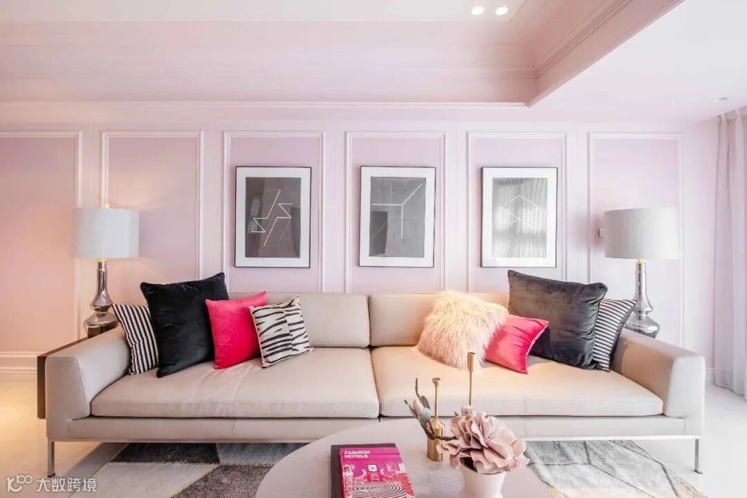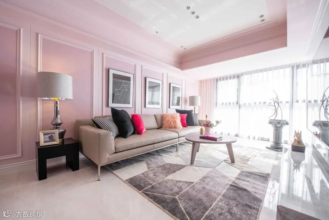 客厅和餐厅采用饱和度较低的粉红色调,有点灰粉的感觉。