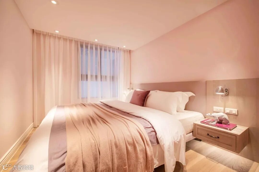 另外一间次卧空间比较小,就让粉红色进到卧房里,粉白色调和整体房子的风格配起来更为协调。