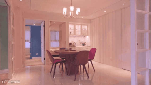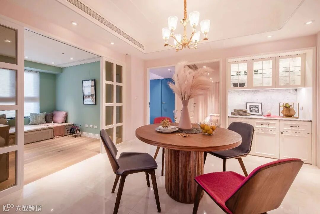 餐厅延续客厅的粉色,空间不大,圆桌配4张椅子,隐藏式门板推开就是厨房。