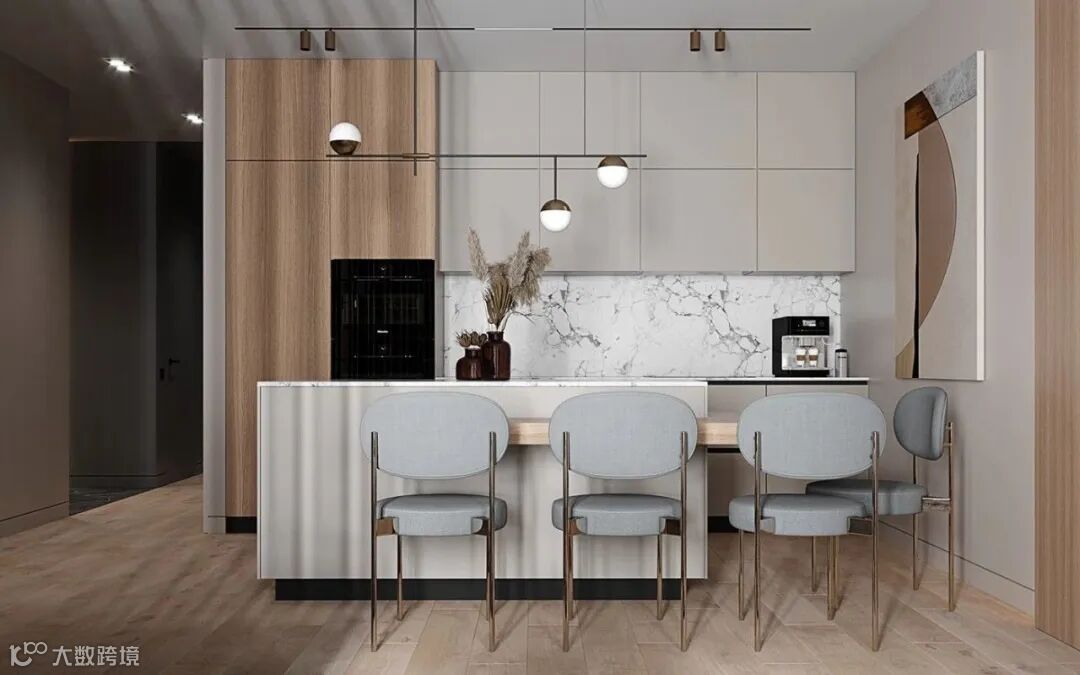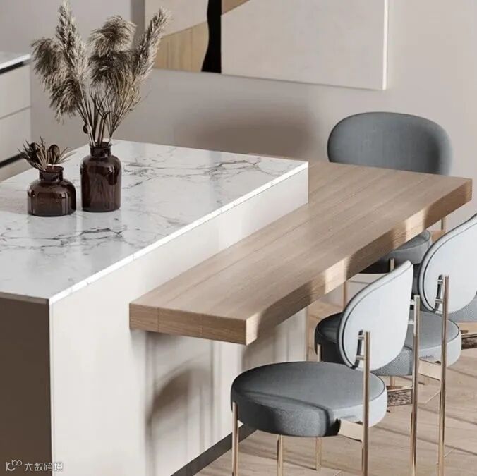 原木色橱柜,白色大理石岛台