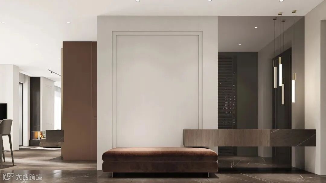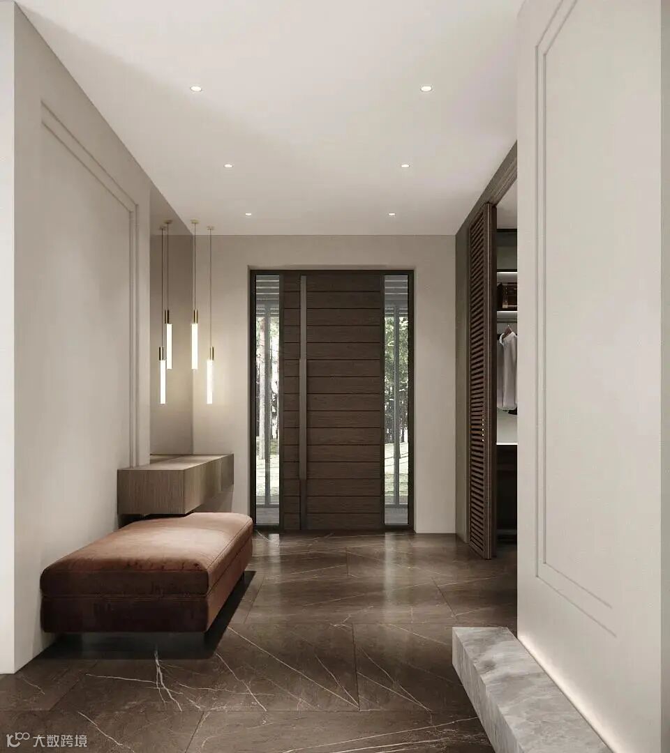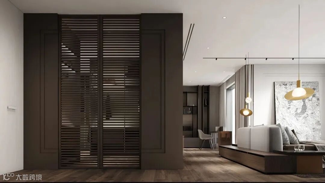 玄关处借深色隔栅的铺陈以及气氛灯光的设计