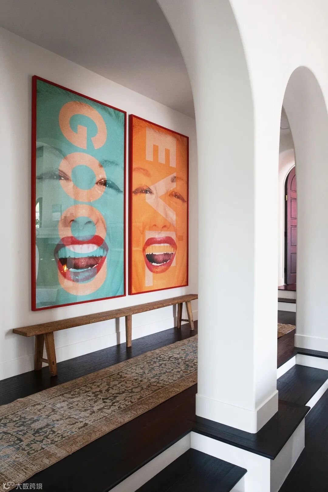 与家具和饰面柔和的色调形成鲜明对比的是一些当代的艺术收藏品,为这个组合增添了不少震撼的色彩。