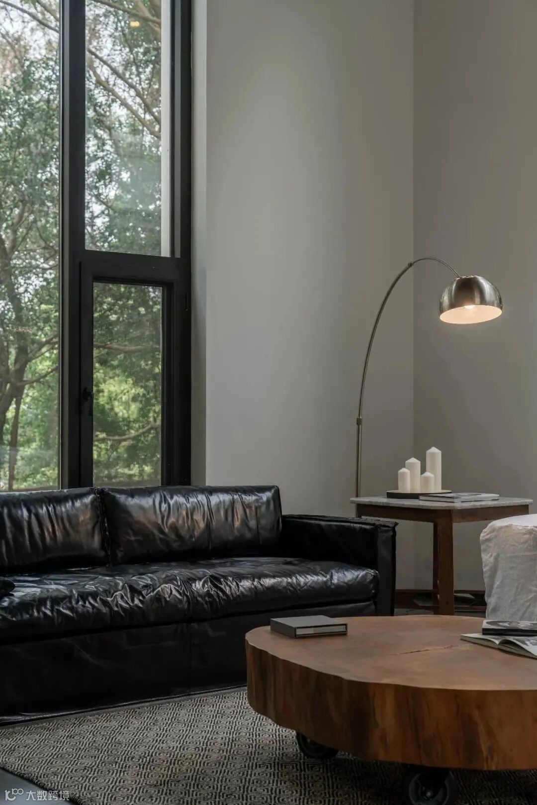 深色调的皮质沙发、长方形几何地毯,在这样的空间产生奇妙的设计反应,雅致又不高冷。