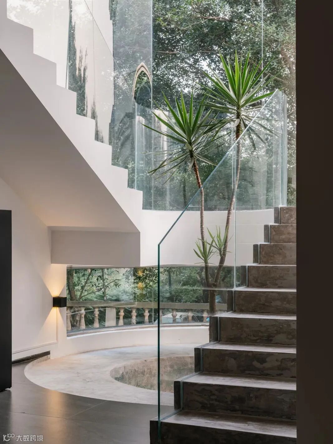 楼梯优雅地贯穿两个楼层,在各个转角能隐约看到远处树林轮廓,低头俯瞰客厅,近景中景远景都有,美无处不在。