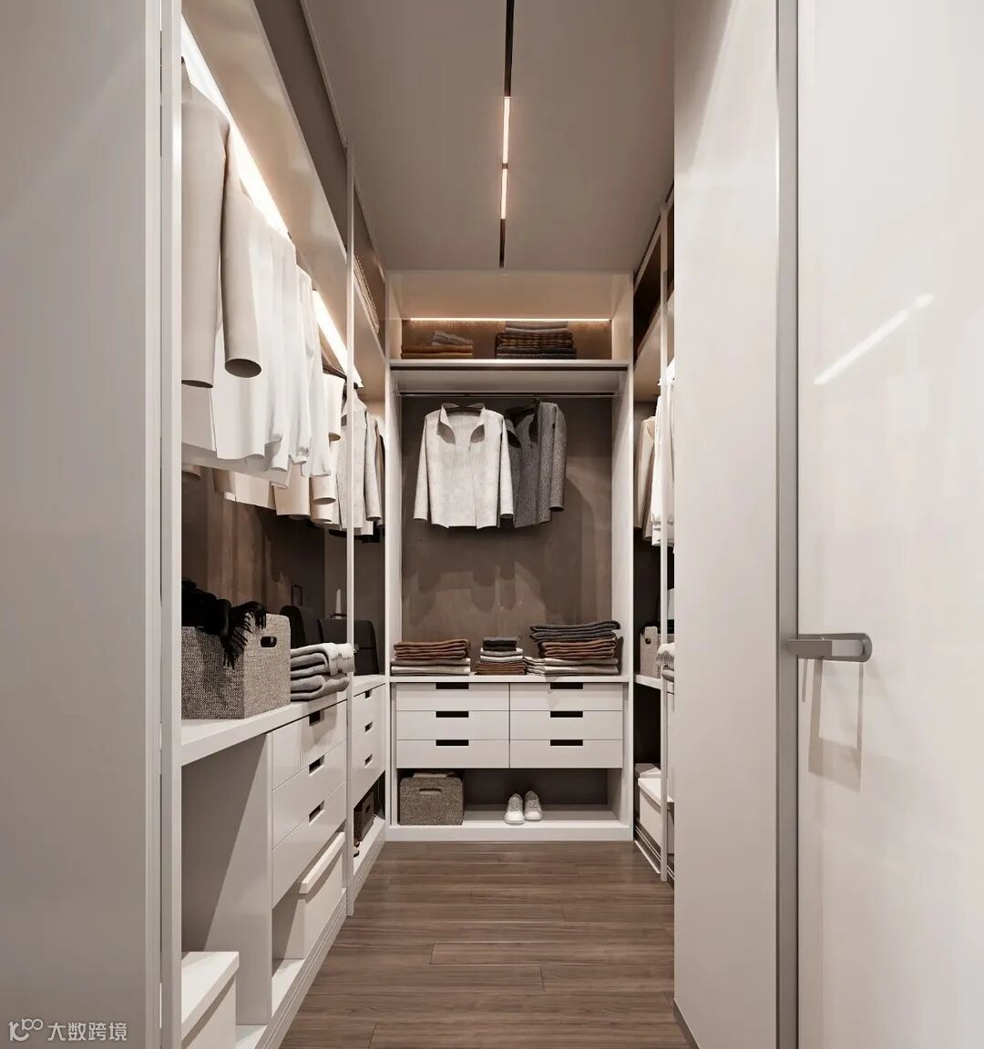 对于小户型而言,可以选择嵌入式的,只要家里有4平米以上的空间,都可以通过定制衣柜、内部间隔来打造一个专属的衣帽间。