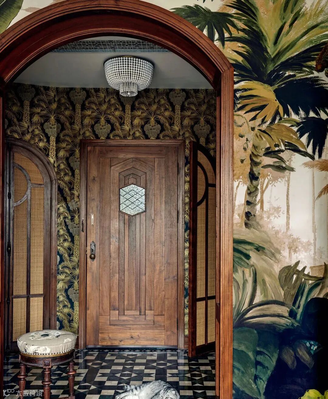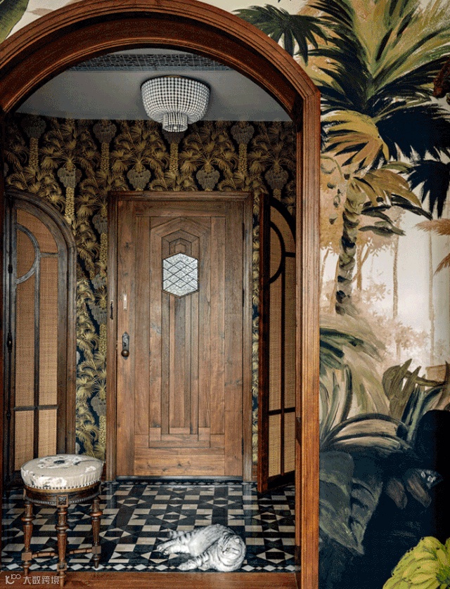 玄关地板采用着摩洛哥花砖的传统纹样,壁纸采用“好莱坞棕榈树”主题,重复的金色棋盘格印花,多而不乱,创造出既现代又传统的效果,与其他空间的都市丛林风格毫不违和。