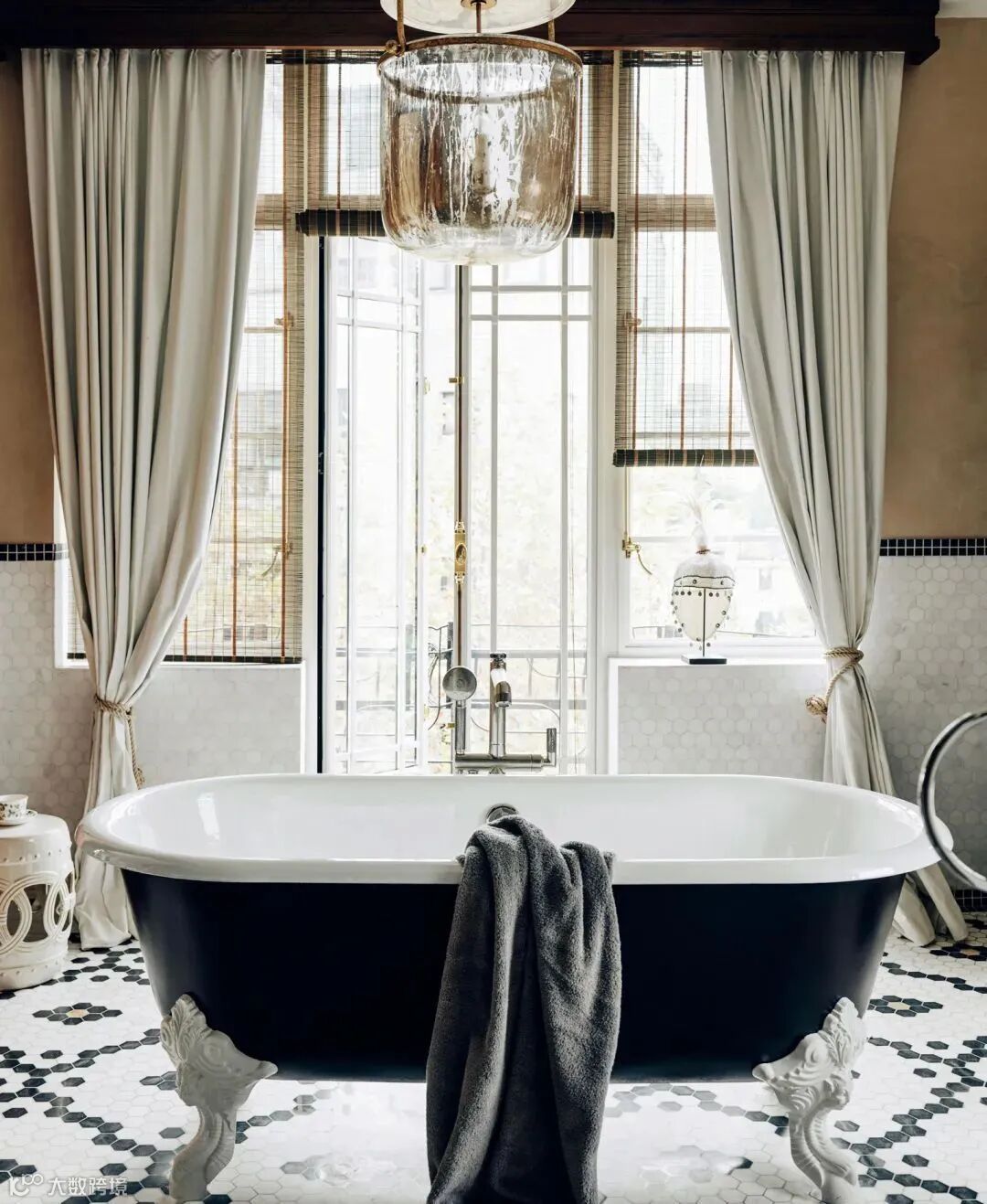 下半部分拼贴着马赛克瓷砖,与地面的花样完美衔接,一直延伸至窗外的露台。