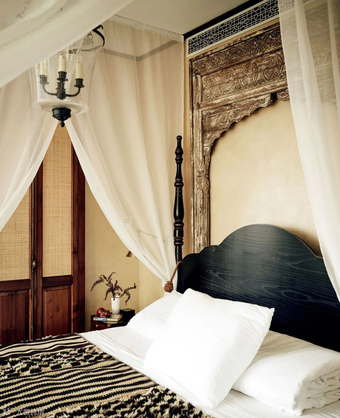 主卧的床头装饰来自印度,米白色的帷幔增添了不少度假气息,羊毛床盖来自摩洛哥。