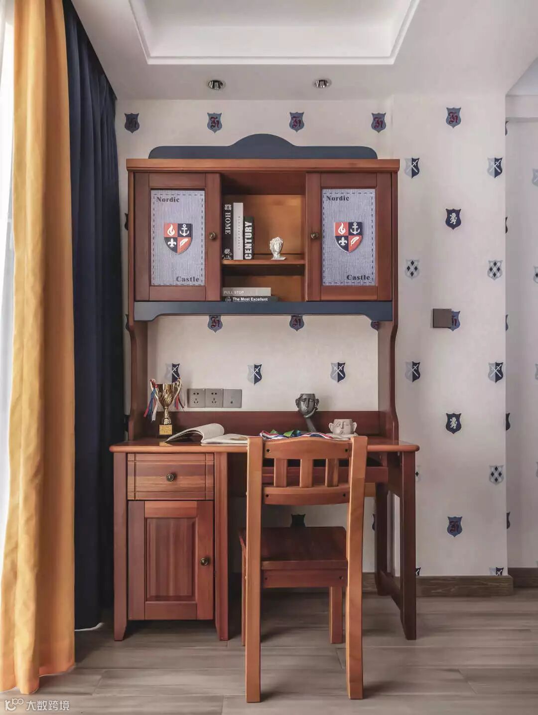 书房整体以蓝色和木色为主调,这两种色调的融合,清新淡雅,点缀上些许金色,更多一份轻奢精致。