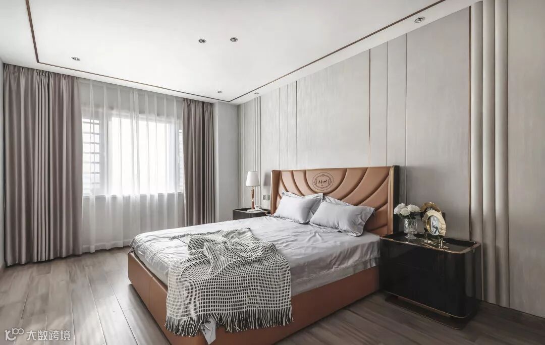 卧室对称布局优雅大气,以雅致灰色调为主,局部使用橙色提亮,为空间注入活力,轻柔时尚的色调展示卧室的舒适轻奢。