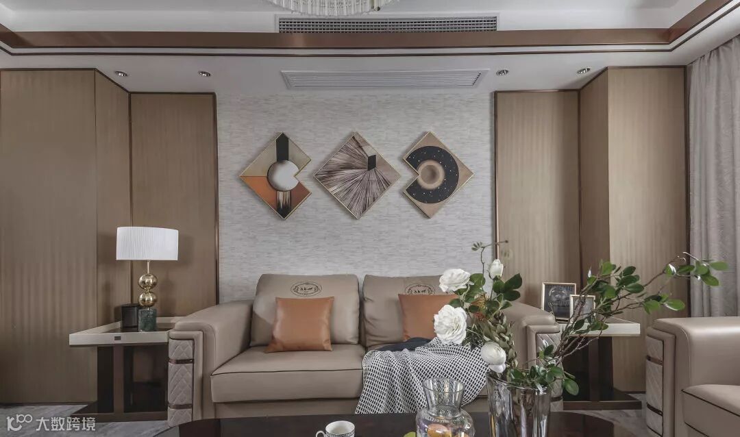 再点缀低饱和度的拉丝黄古铜与橙灰色作为辅色,使空间的色彩搭配极具层次感,再加一些艺术的画作,增添空间的内涵。