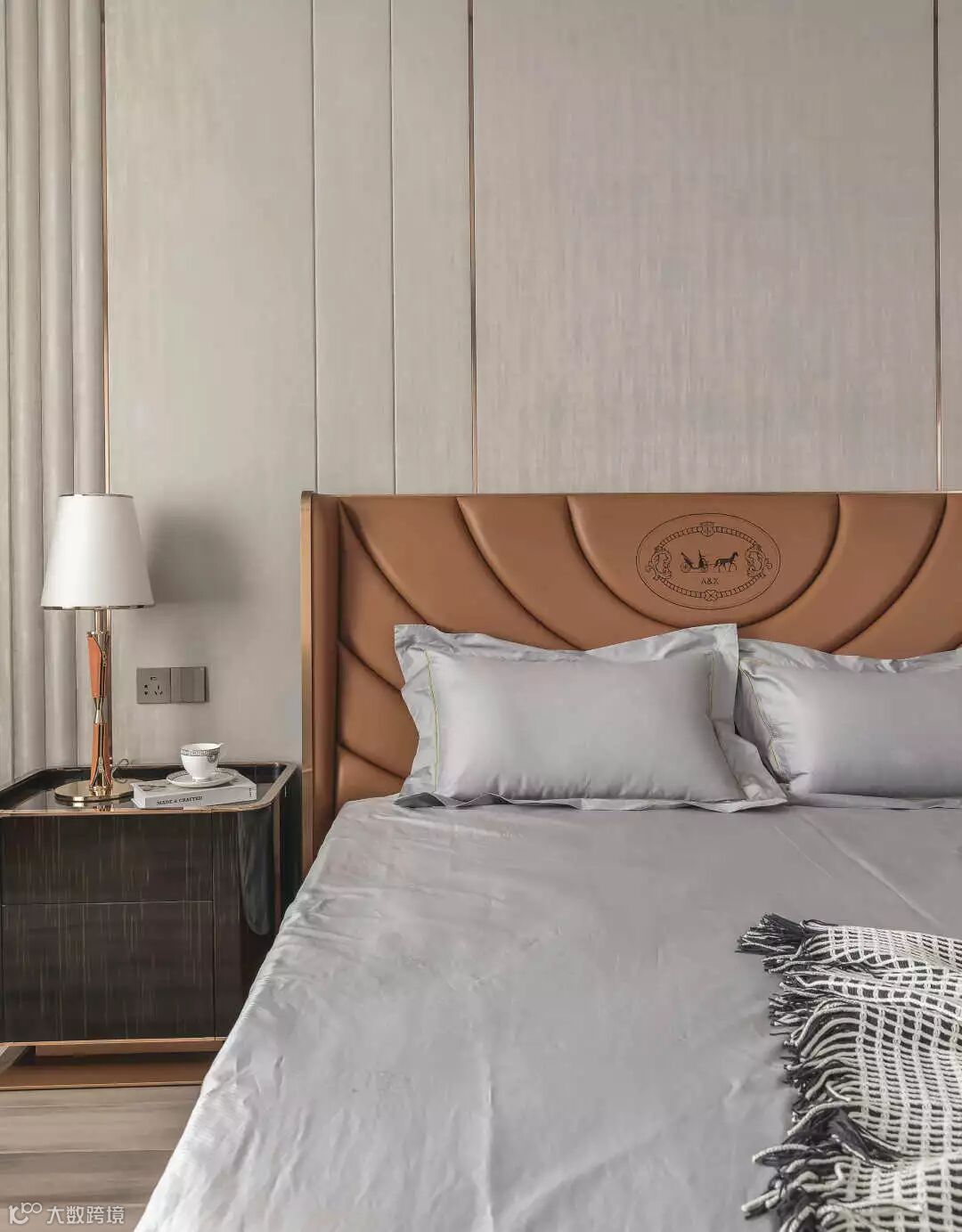 陈设则利用不同灰色的棉麻布艺、皮革过渡,搭配拉丝黄古铜金属和玻璃等配饰,材质丰富不失细腻。