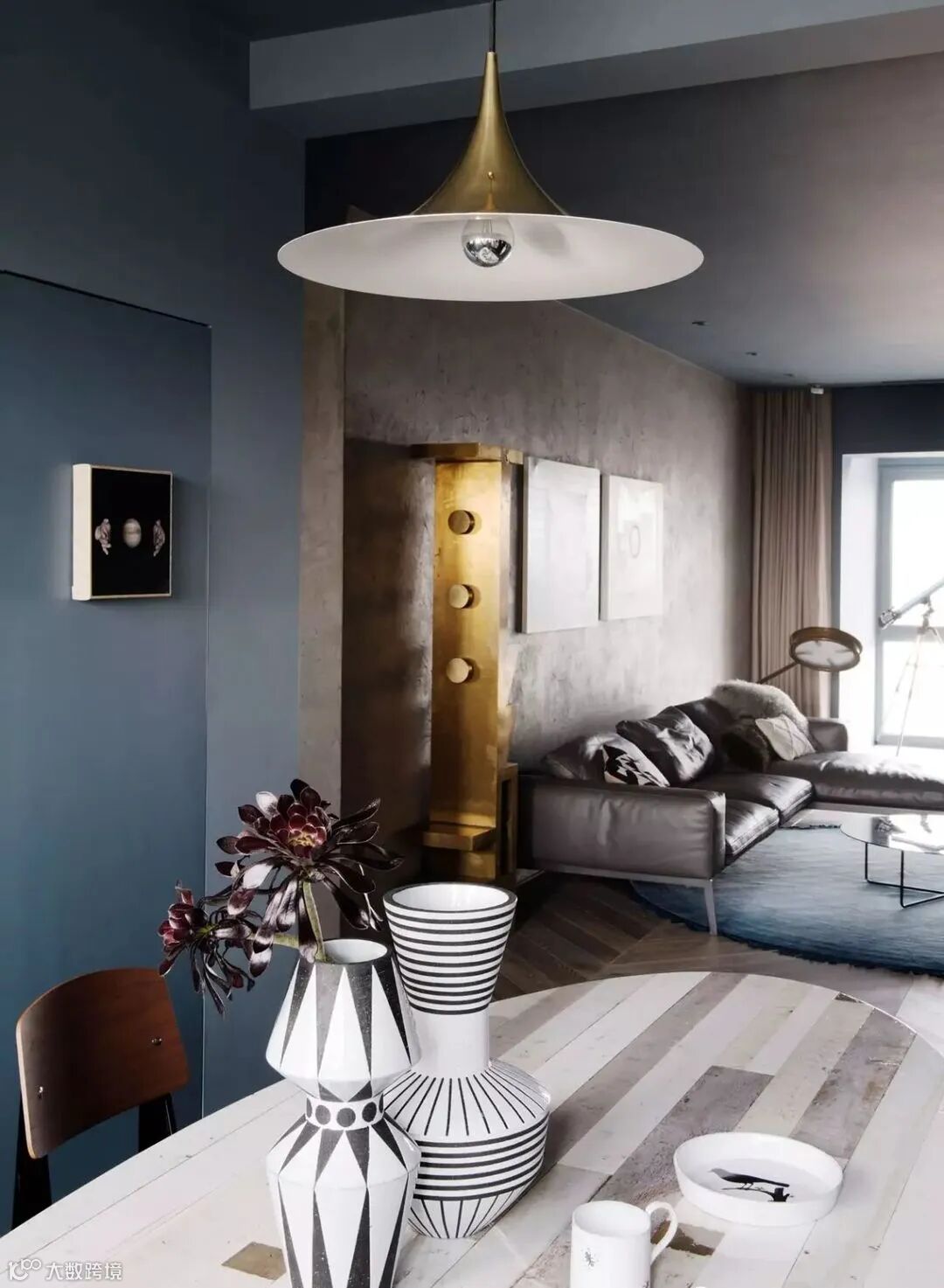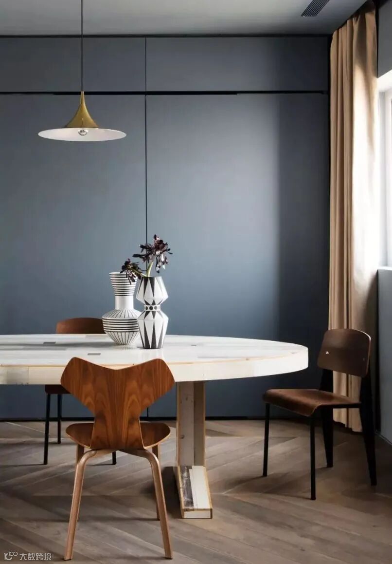 桌上悬挂着的金色吊灯和黑白花瓶让空间带着一点别样的风情。