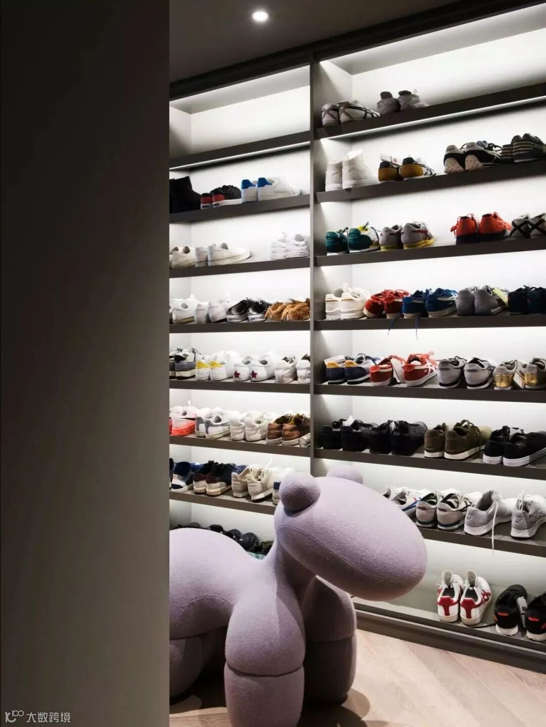 里面的衣物鞋帽都摆放得井井有条,其间的焦糖色与走廊、卧室的蘑菇色形成不同层次,温柔而安静。