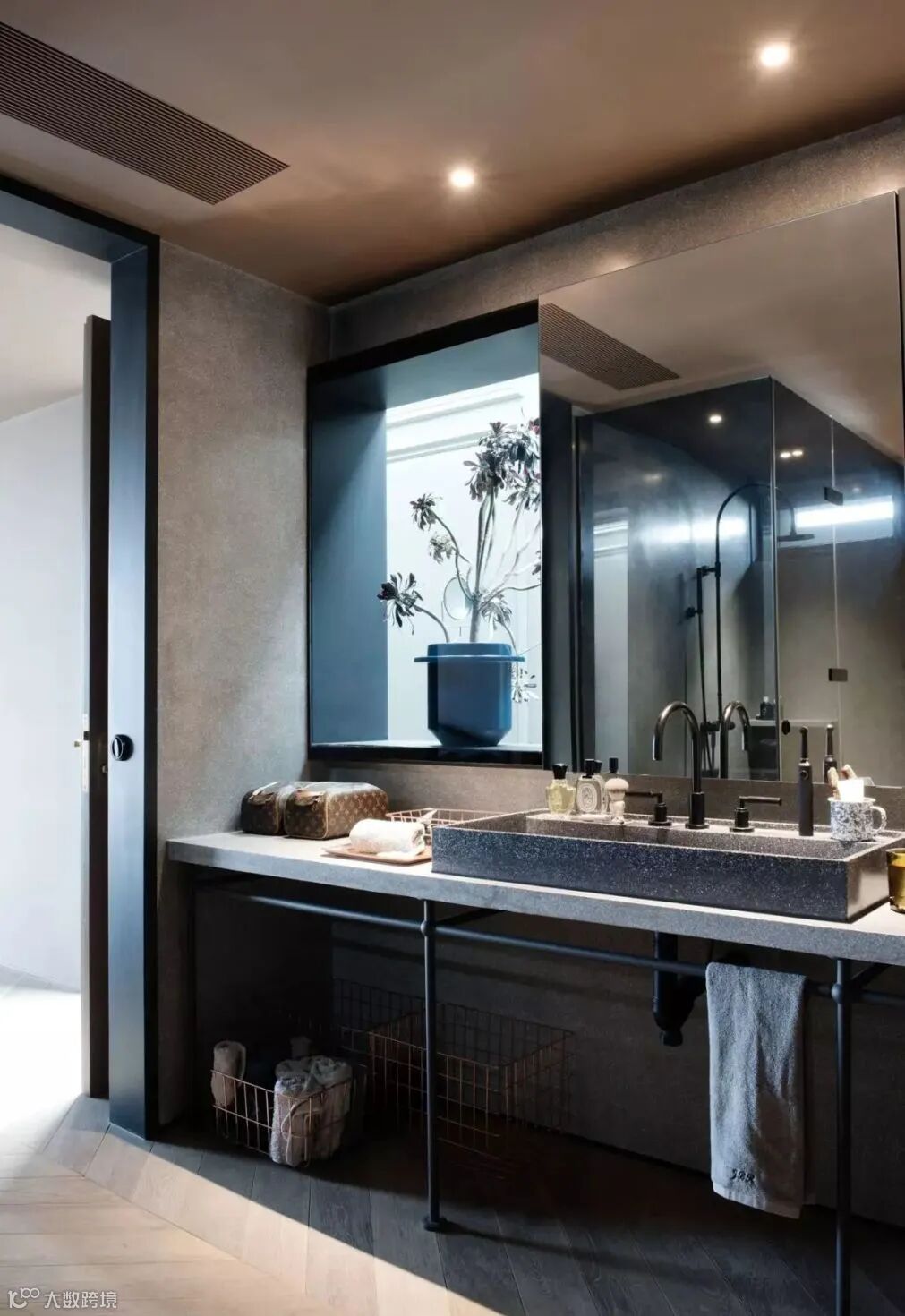 主卧的洗手间采用了时下流行的水磨石材质,与金属配件组合在一起工业感十足。
