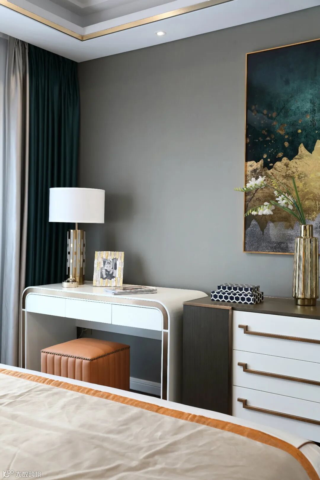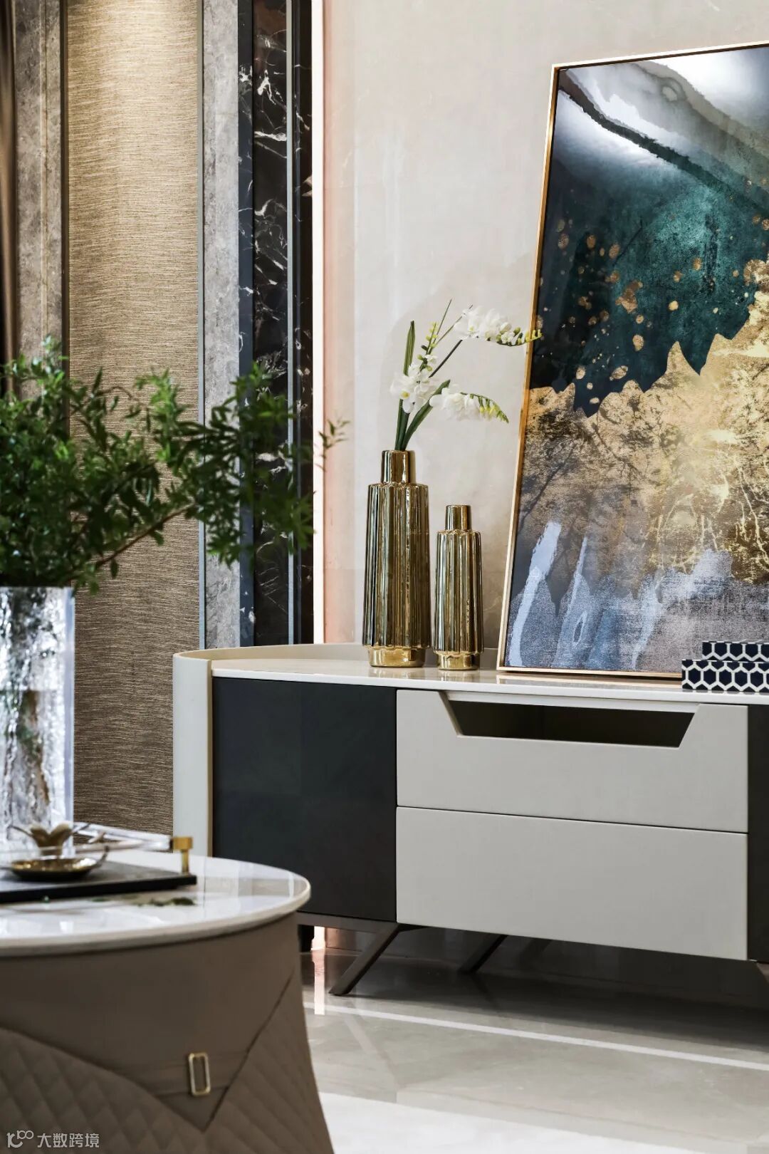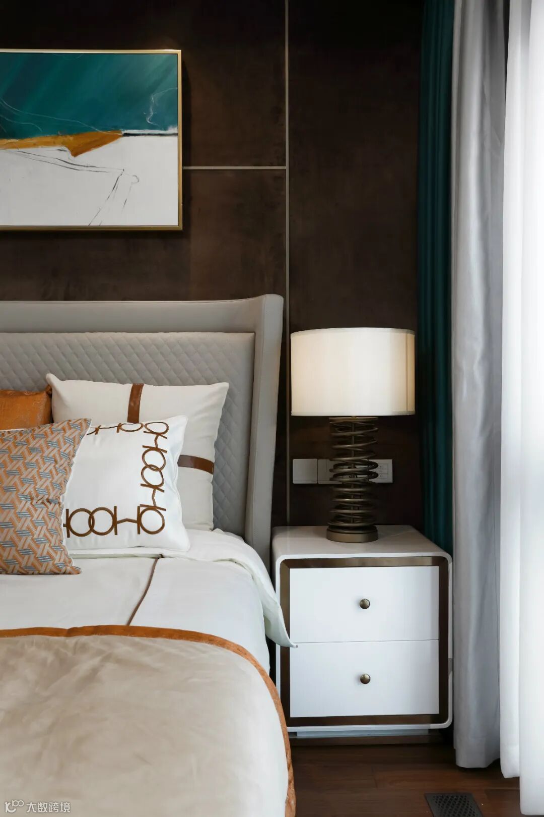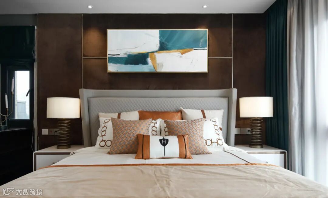 别具一格的铜质灯饰、巨幅装饰画和撞色地毯