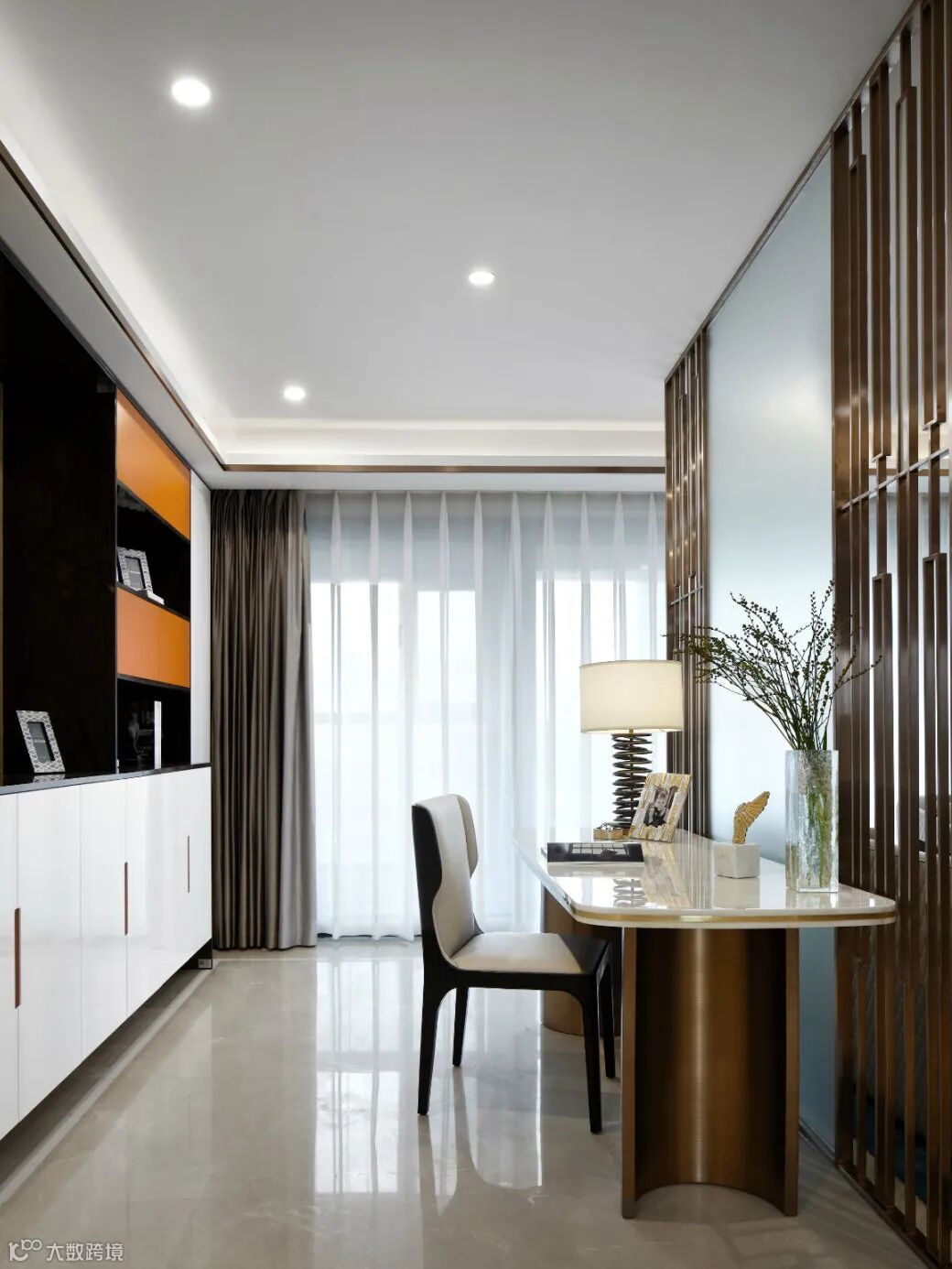 竖格纹路的木质屏风与艺术装置相映衬