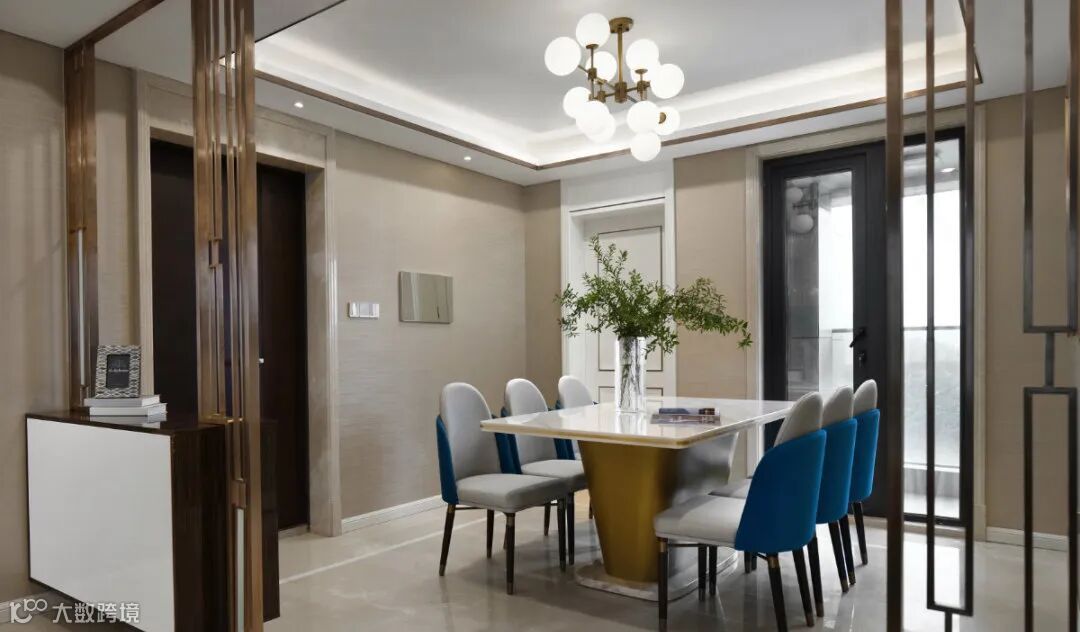 奢华的金色底座和亮蓝色靠背点缀在空间中