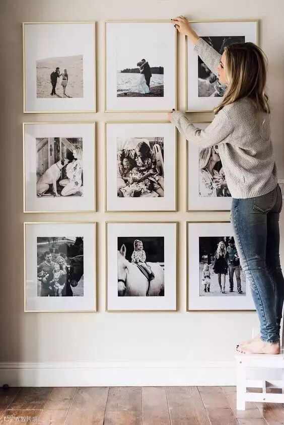 5、上水平线齐平挂法:既有灵动的装饰感,又不显得凌乱。如果照片的颜色反差较大,最好采用统一样式和颜色的画框来协调。