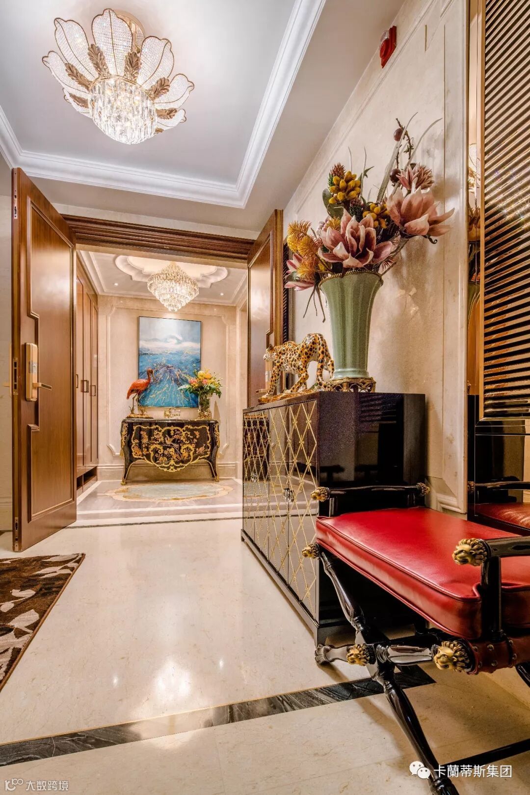 入户电梯间放置非常实用的一款经典大气的鞋柜,红色皮质的换鞋凳,加上古铜的金属让整体空间沉稳、贵气。