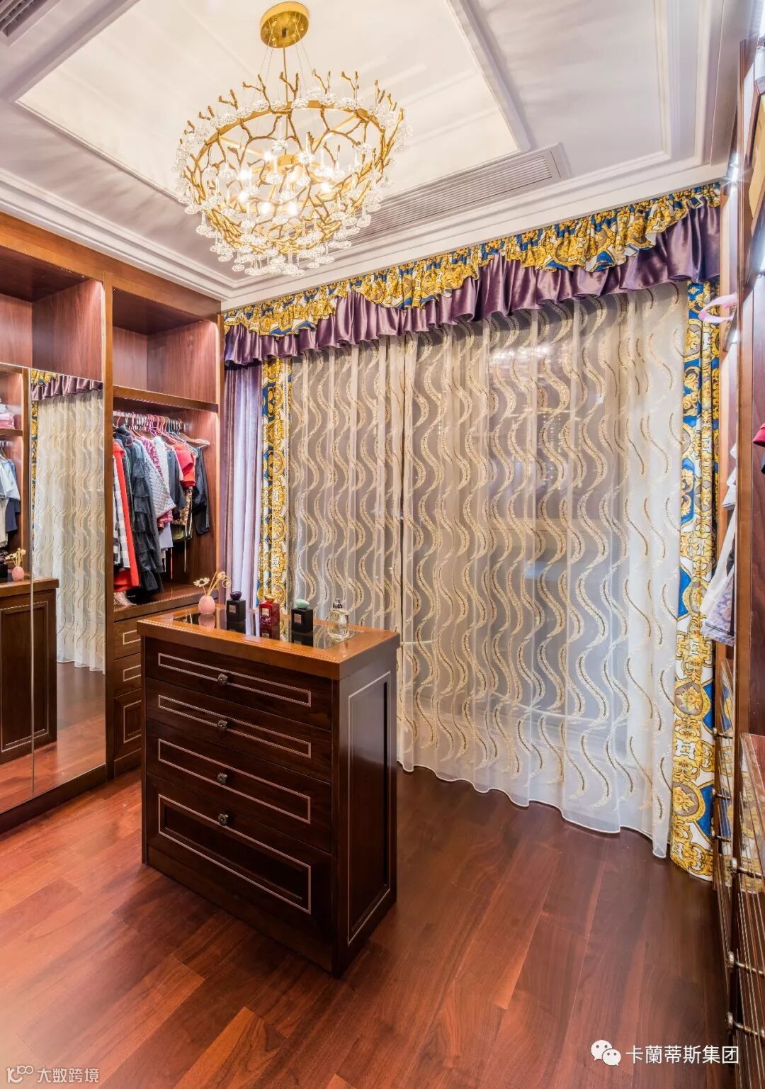 衣帽间的灯具和窗帘,都是按照主人的喜好搭配,空间通透华丽,中间饰品柜盛满了主人的生活品味。