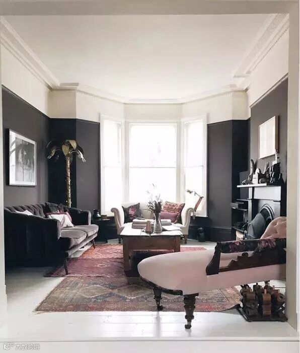 而且,这种白色地面、白色屋顶及墙体上半部分的白,跟深色一搭配,丝毫不会有任何让人有压迫、不适感。