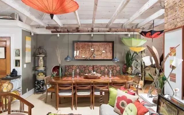 把民族风混入家居设计,加上木质的家具、淡淡的色彩,真是很异域风情。
