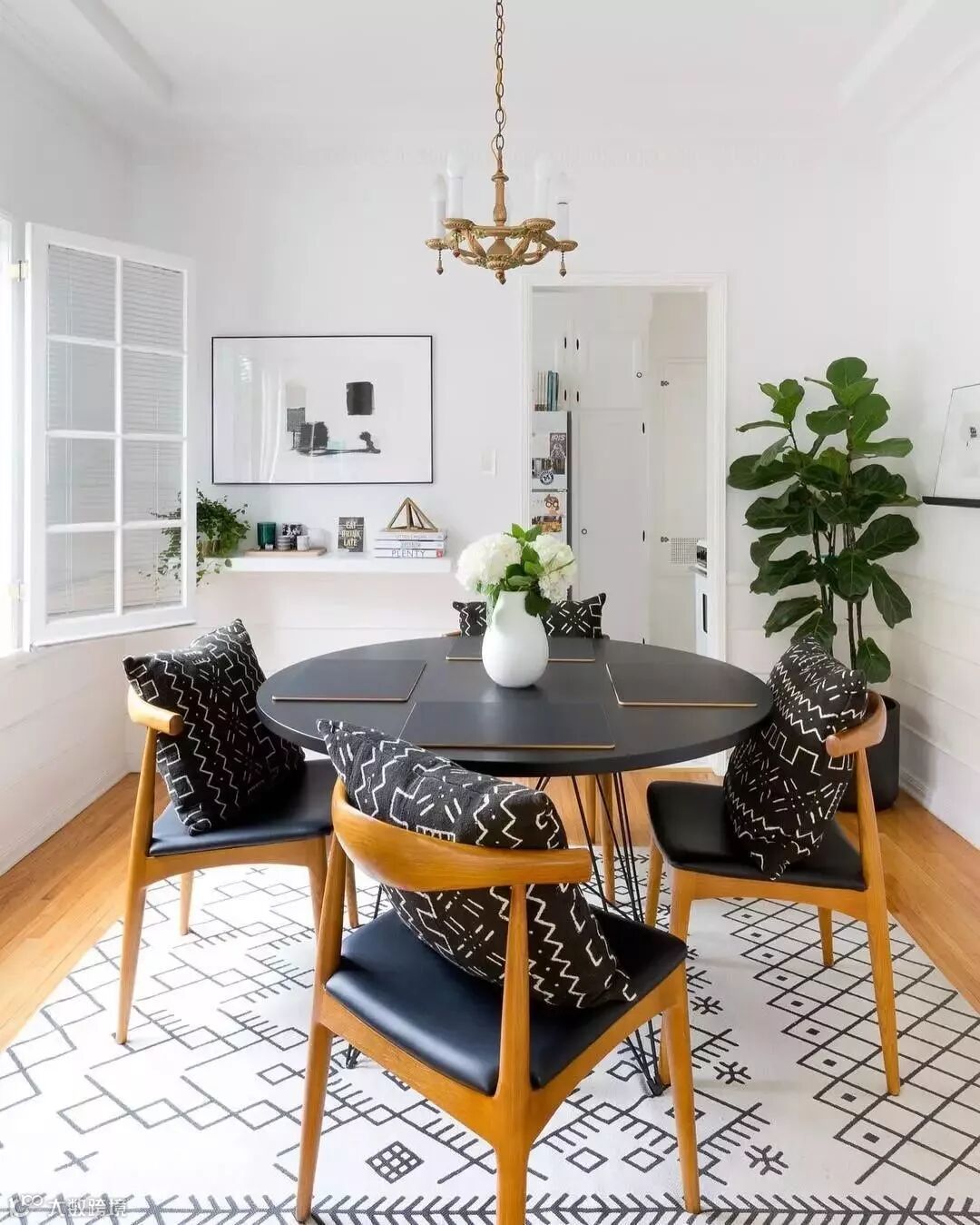 餐厅一角,是色彩具有强烈反差的黑与白,全黑的桌面、椅面,黑白相间的抱枕、地毯,加上远处同样呼应的黑白装饰画。