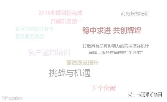 热烈祝贺卡蘭蒂斯集团2018年中会议圆满结束。卡蘭蒂斯集团坚持卓越艺术空间打造,优先发展相关产业,专注高尚生活领域,努力把主导产业做强做大,形成竞争优势,为中国的高端装饰设计发展发挥自己的能量。