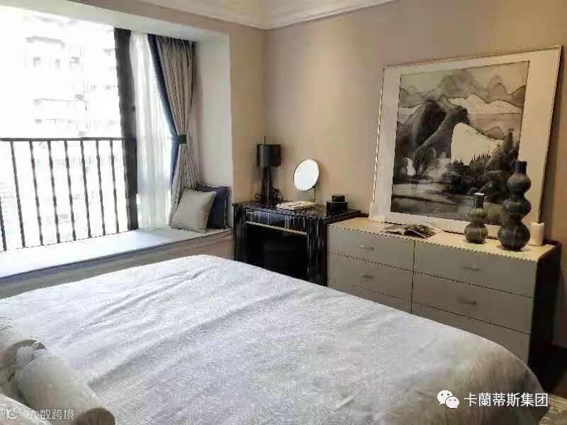 别具现代轻奢感的主卧。设计风格延续了“港式格调”的线条感,浅灰色的低调、米色的柔和,在看似简洁质朴的外表下隐藏着低调的贵气感,营造出舒适惬意的睡眠环境。