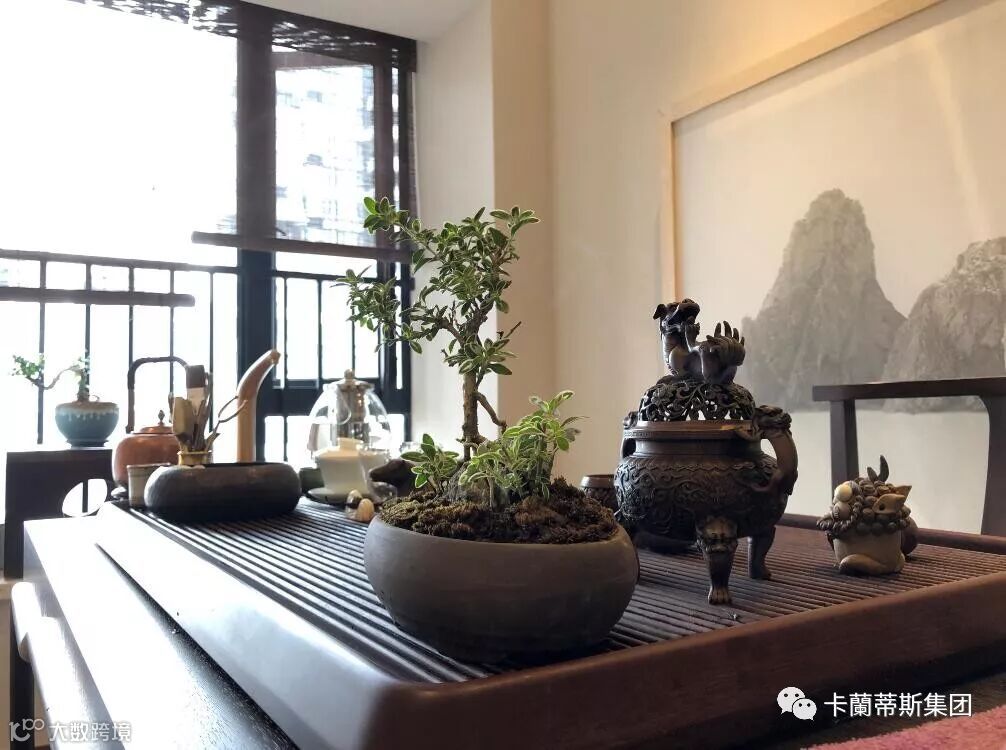 书房局部中式意味浓厚,盆景、茶具无不透露出主人的野趣与品位。