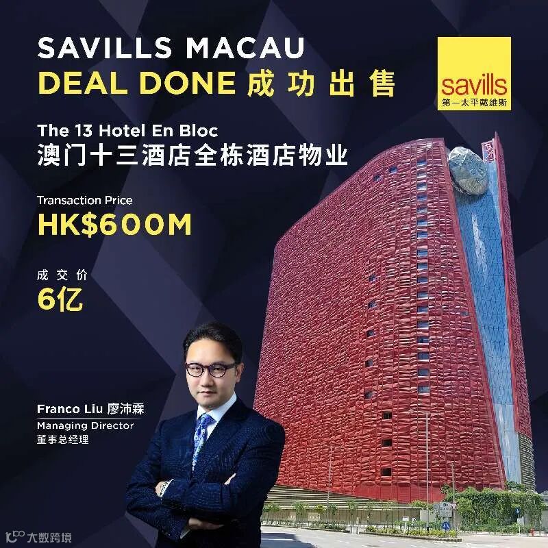 国际房地产顾问第一太平戴维斯(澳门)有限公司今日宣布,经历五年持续推动,成功促成澳门2025年首宗酒店物业交易,位于澳门路环石排湾马路及Aterro da Concórdia Lote 1地段的十三酒店,成交金额达6亿港元。此次交易不仅彰显团队专业执行力,更为澳门「非博彩元素」政策落地提供重要市场印证。