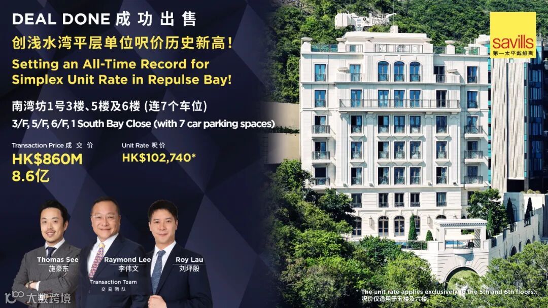 第一太平戴维斯香港欣然宣布,成功促成香港南湾坊1号3楼、5楼及6楼的成交,总成交金额高达8.6亿港元,单位尺价达102,740港元 (5楼及6楼),刷新浅水湾平层单位尺价纪录!
