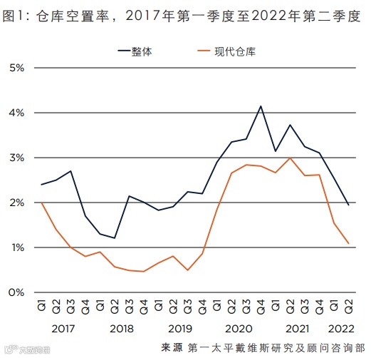 不过,与上季度相比,租赁成交量,尤其是新租赁的成交量有所下降,这是因为物业供应量极低,导致越来越多营运商选择续租而不是搬迁。第二季度的整体仓库空置率下跌至1.9%,现代化仓库的供应量下跌至仅占总库存的1.1%,促使大量现代化营运商押后所有短期搬迁计划。