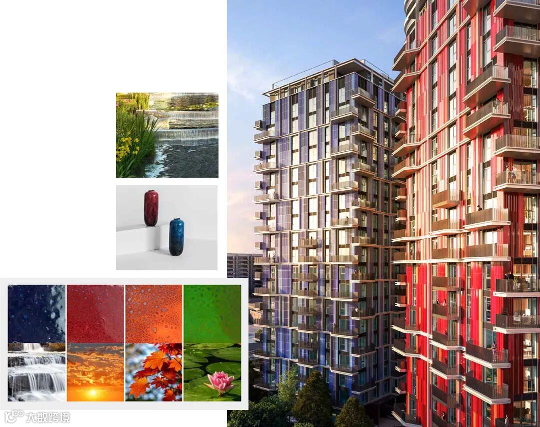 据其介绍,本次设计的灵感来源包括釉面花瓶,以及1908年在当地举办的白城英法世博会Franco-British Exhibition,博览会上的日式花园正好和环绕此处的水岸花园相呼应。四栋楼宇的色彩分属四季,本次先行开售的一号楼Cascades One正是其中的蓝色建筑。