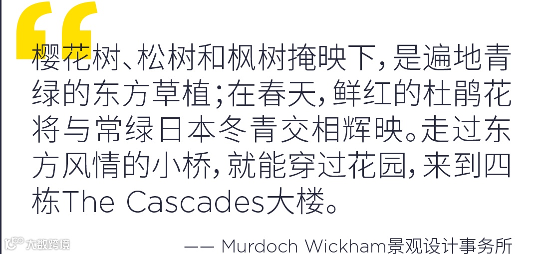 新期Cascades位于项目内侧,四栋色彩斑斓的建筑,蜿蜒在充满东方风情的日式水岸花园Water Gardens旁,花园内有长达150米的层级式小瀑布,Cascades正是由此得名。