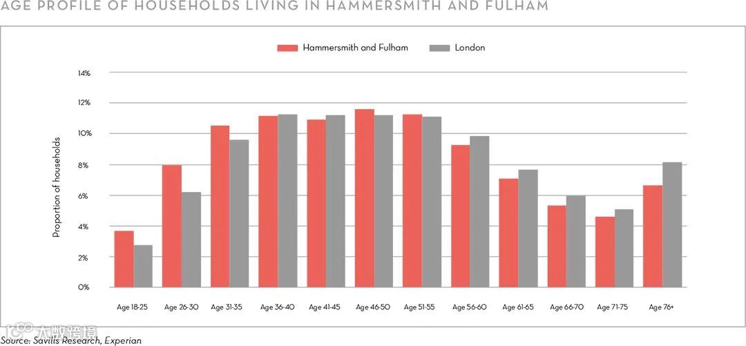 Savills第一太平戴维斯、跨国消费者信用报告公司Experian调查发现,新搬入项目所在汉默史密斯与富勒姆地区的居民中,43%属于40岁以下年龄层,且大都可归为「城市繁荣人群」,即事业起步期的高收入人群,极大程度保证了项目租户质量和健康流动性。