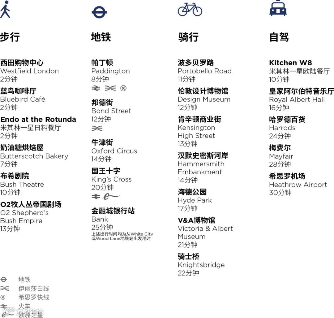 步行几分钟就能到White City、Wood Lane两大地铁站,连通中央线Central Line、哈默史密斯与金融城线Hammersmith & City Line、环线Circle Line三条伦敦地铁干线▼