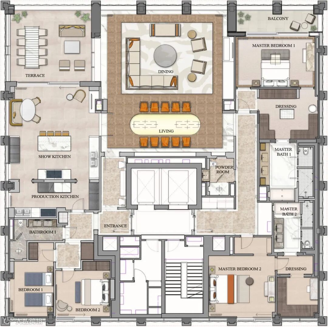 室内以棕、橙等暖色调为基础,起居室、餐厅、厨房、卧室等不同房间通过微妙的深浅和色彩关系加以区分,搭配品质绝佳的选材、细致入微的配置、设计考究的家具,终成大气恢弘的整体生活空间▼
